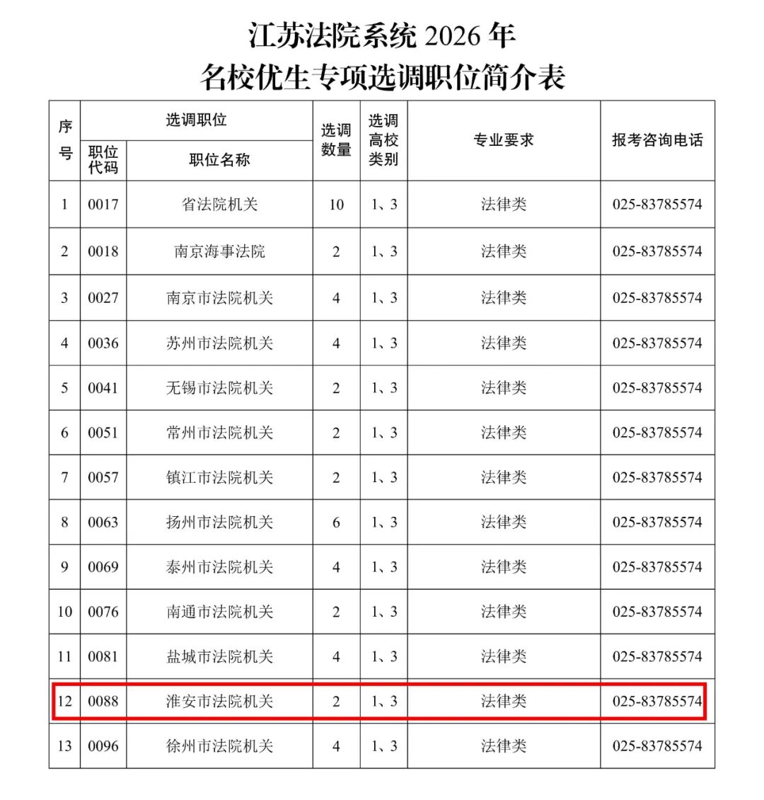 近日,省委组织部发布《江苏省2026年应届优秀大学毕业生选调工作公告》,江苏法院系统名校优生选调工作同步启动,全省法院选调法律类专业名校优生48名,其中淮安市法院选调2名。