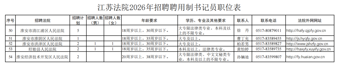 根据工作需要,江苏法院面向社会公开招聘聘用制书记员202名。其中,淮安法院5家基层法院面向社会公开招聘。现将有关事项公告如下: