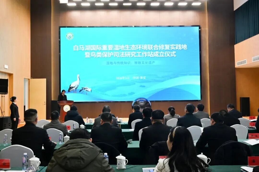 2026年2月2日,正值第30个世界湿地日,江苏淮安白马湖国际重要湿地迎来里程碑时刻——白马湖国际重要湿地生态环境联合修复实践地暨鸟类保护司法研究工作站成立仪式在此举行。淮安市副市长封蕴珊,淮安中院党组书记、院长郁奇,省法院环资庭庭长周亚冠出席仪式。活动由淮安中院党组成员、副院长李玲主持。