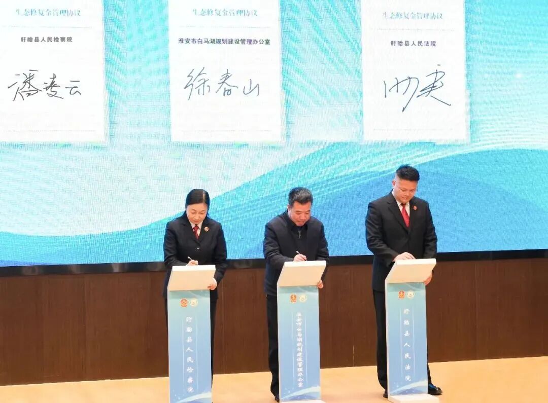 市白马湖规划建设管理办公室党组书记、主任徐春山,盱眙县法院院长田庚、盱眙县检察院检察长潘凌云共同签署《生态修复金管理协议》,规范资金使用,确保“每一分钱都用在修复刀刃上”。