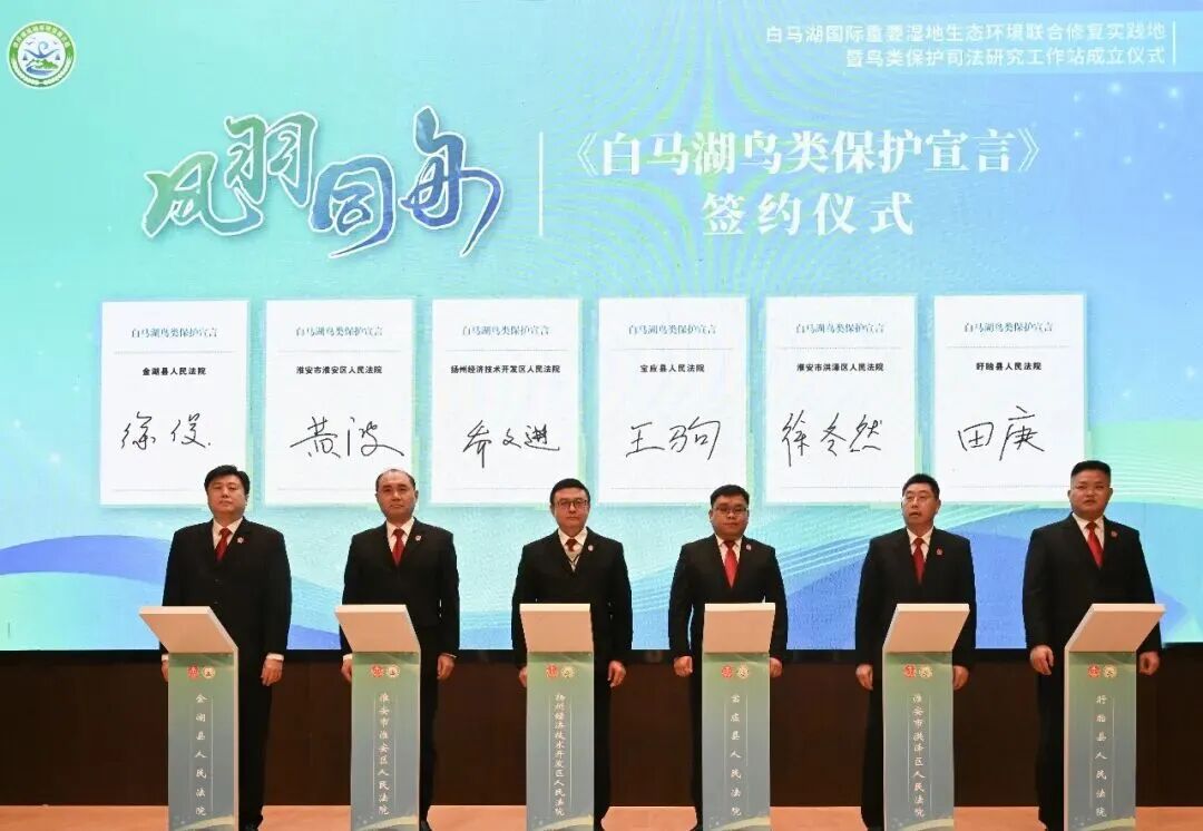 扬州市经开区法院、宝应县法院、淮安市淮安区法院、淮安市洪泽区法院、金湖县法院、盱眙县法院共同签署《白马湖鸟类保护宣言》,为鸟类保护划定“法律红线”,形成“协议管总、资金保障、措施落地”的闭环体系。