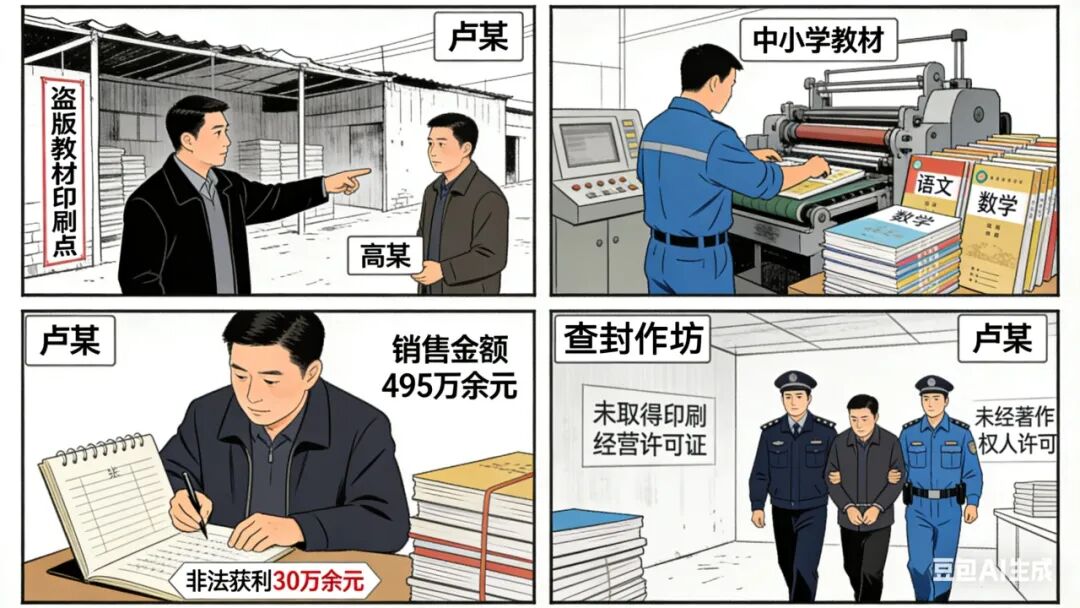 【基本案情】2022年5月至2023年8月,被告人卢某在未取得印刷经营许可证、未经著作权人许可及享有专有出版权的出版社同意的情况下,雇佣高某等人在多地搭建印刷作坊,非法印刷、销售盗版中小学教材,销售金额累计495万余元,非法获利30万余元。同期,被告人张某、谈某等人合谋,从卢某等人处购买盗版教材,通过线上及线下渠道对外销售,销售金额累计780万余元,非法获利140万余元。2023年8月,执法机关在张某等人经营场所查获盗版书籍36万余册,码洋价280万余元。